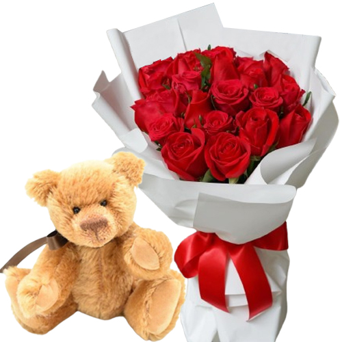 12 stunning red roses with a soft teddy bear are Perfect for expressing love and affection.