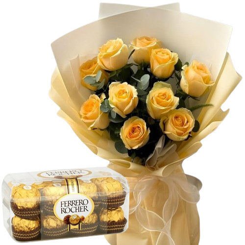 Impress your loved one with a stunning 12 Yellow Roses Bouquet and 16 Ferrero Rocher Chocolates—a luxurious gift of love, sweetness, and elegance.